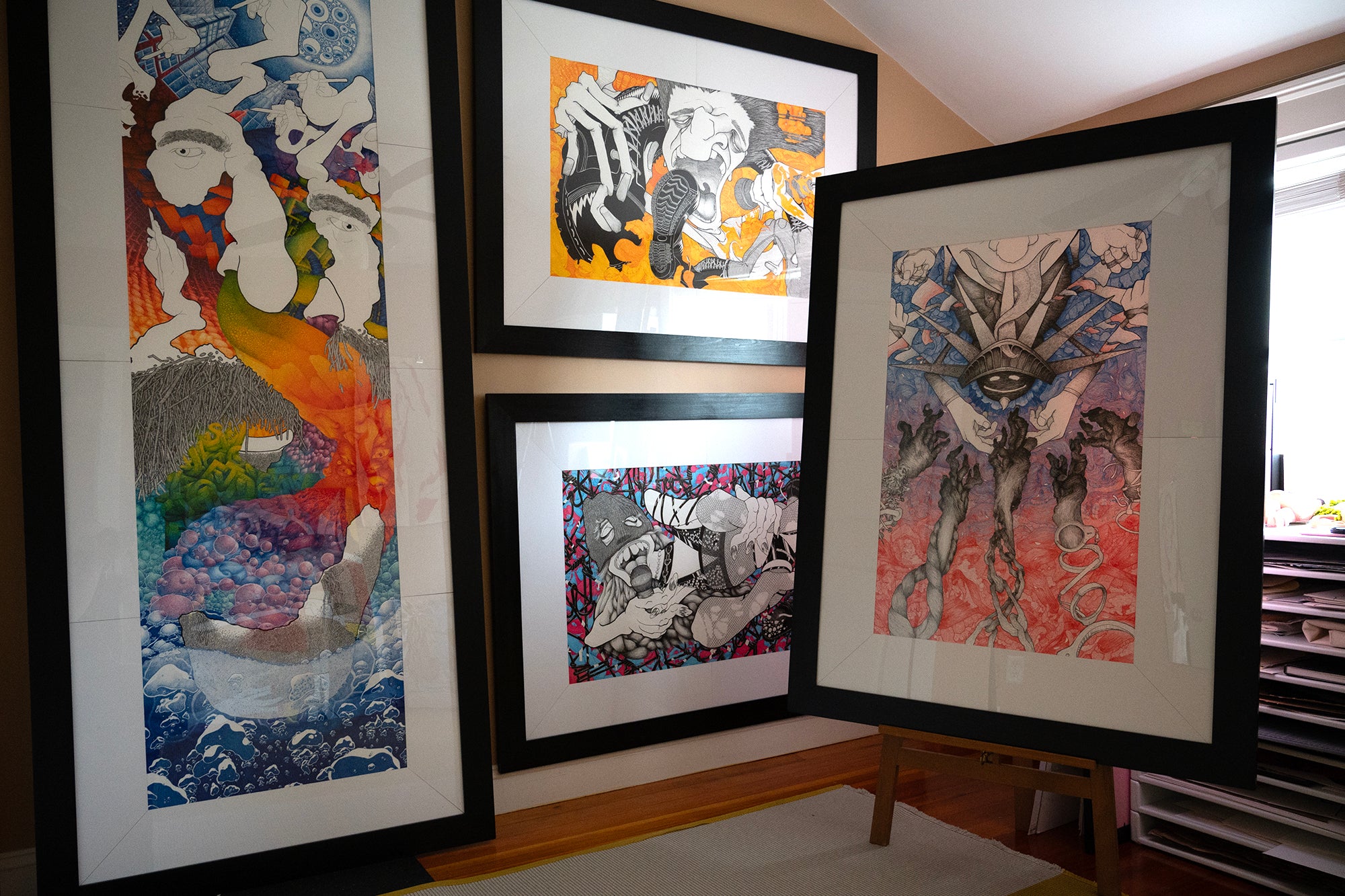 In this isolation I am able to block the world out and the ease away the stress in the calming steam. Here I am able to focus entirely on my thoughts and build a world piece by piece through the lens of my detailed but juvenile style. The ideas are rough and fractured, and the end result of this practice may leave work unfinished, but I can begin to imagine how it will be perceived – and this is what works for me.