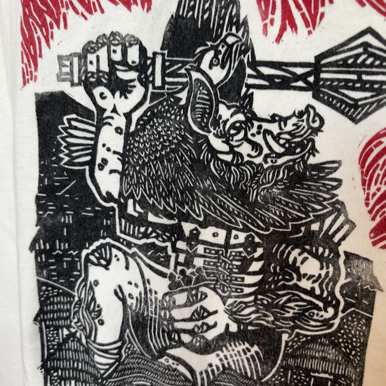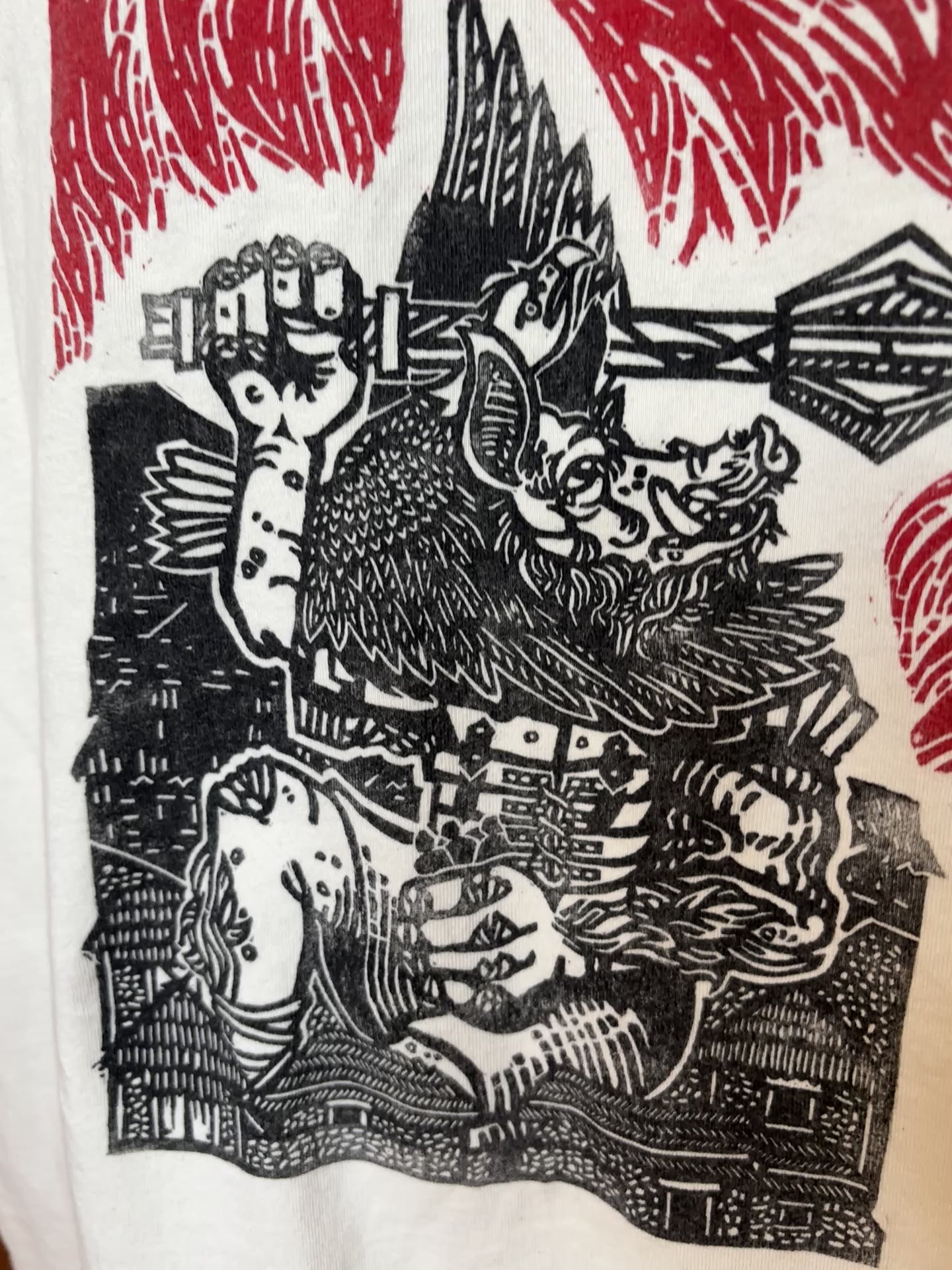 Blockprinted design stamped onto USA-made unisex t-shirts. All shirts are pre-washed once printed.