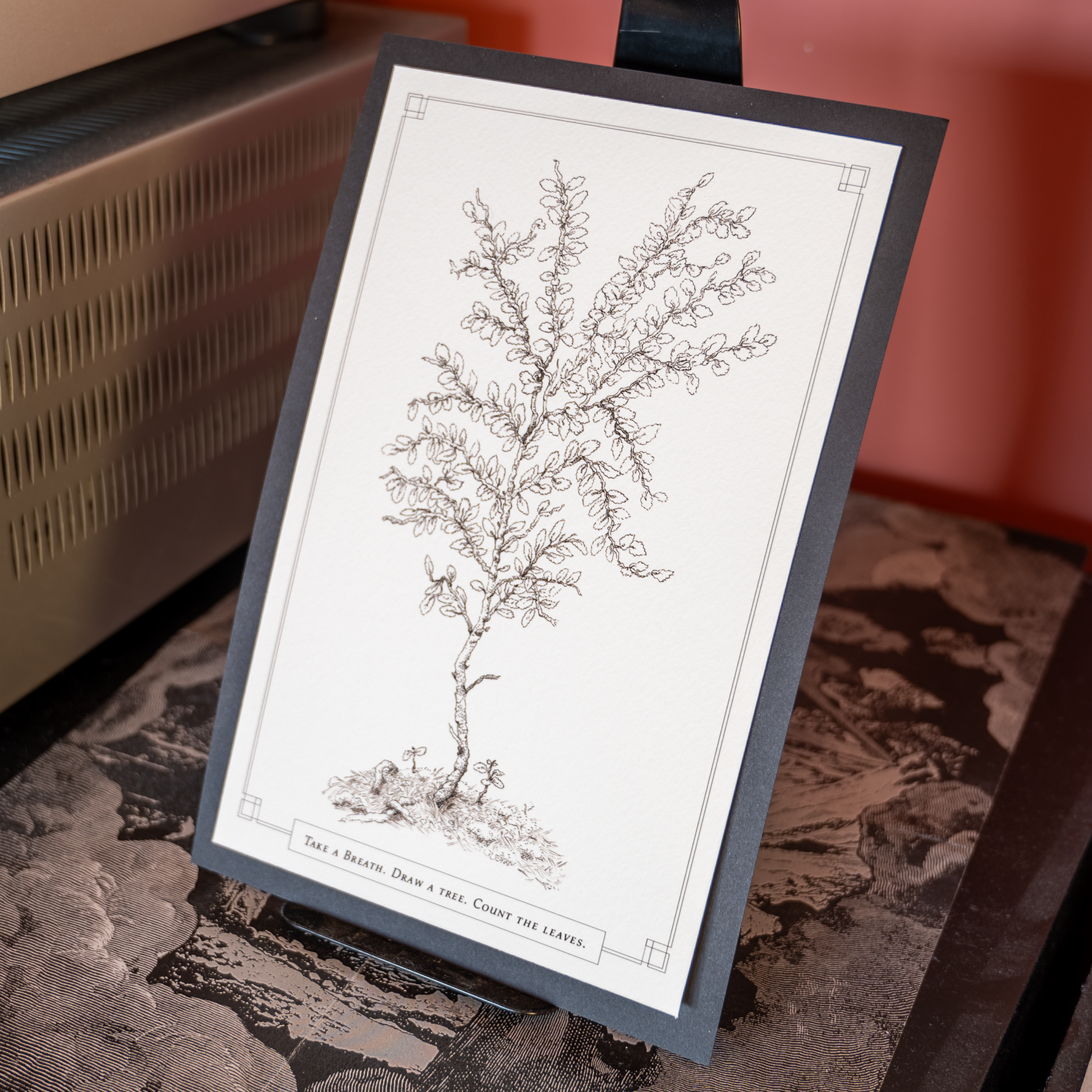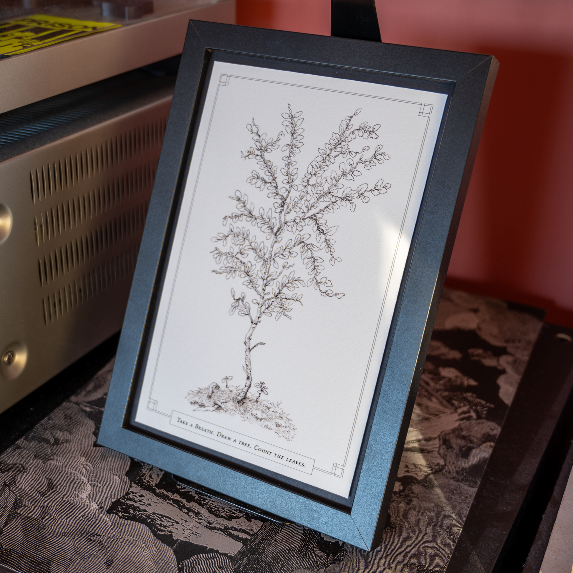 Being present in the moment in an age of constant stimulation is tough. I’m frequently caught up thinking about the ways that I could be productive at every moment of day, or things that I should have or shouldn’t have done in the past. On a recent camping trip I couldn’t ground myself despite the calming views surrounding me and that was difficult. So I grabbed a sketch pad, took a breath and drew a little tree I saw in a forest of giants. Drawing each individual leaf helped to bring me into the moment, and I could finally smell the forest, the campfire, and melt my racing thoughts away. I hope this can bring you the comfort it brought me in this era of anxiety.